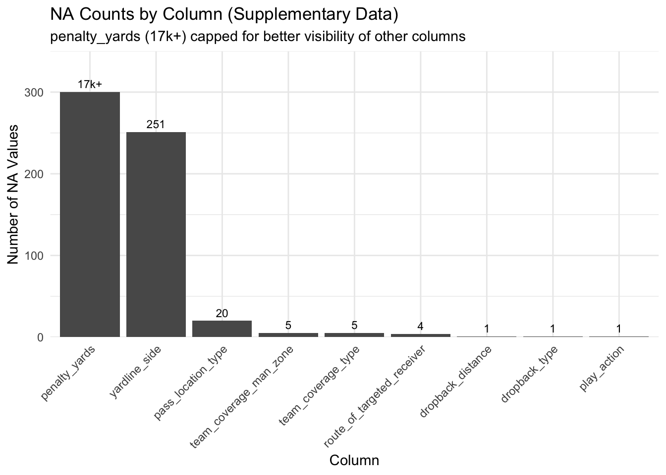 # Get NA counts for each column in supplementary datasetna_by_col <-data.frame(column =names(supplementary),na_count =colSums(is.na(supplementary))) %>%filter(na_count >0) %>%arrange(desc(na_count))# Cap penalty_yards for better visualizationna_by_col_capped <- na_by_col %>%mutate(na_count_display =ifelse(column =="penalty_yards", 300, na_count),label =ifelse(column =="penalty_yards", "17k+", as.character(na_count)) )# Bar chart with capped scaleggplot(na_by_col_capped, aes(x =reorder(column, -na_count), y = na_count_display)) +geom_col() +geom_text(aes(label = label), vjust =-0.5, hjust =0.5, size =3) +scale_y_continuous(limits =c(0, 350), expand =expansion(mult =c(0, 0))) +labs(title ="NA Counts by Column (Supplementary Data)",subtitle ="penalty_yards (17k+) capped for better visibility of other columns",x ="Column",y ="Number of NA Values" ) +theme_minimal() +theme(axis.text.x =element_text(angle =45, hjust =1))